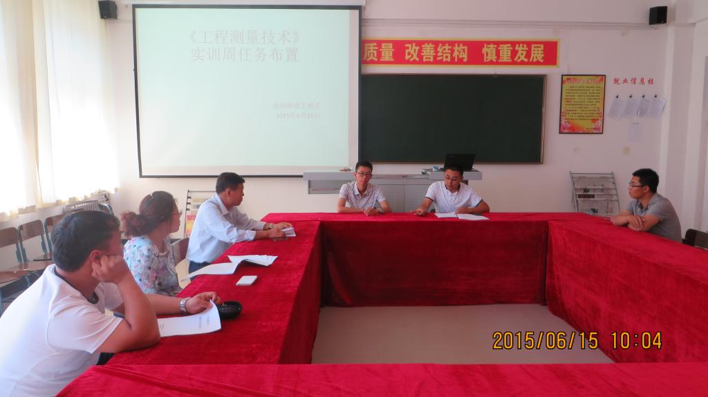 为贯彻落实教学计划,按照人才培养方案要求,我系将6月23日—6月29日定为测量实训周。为充分达到教学目的,合理布置教学任务,2015年6月15日,道路桥梁工程系组织测量教师在3号教学楼302会议室召开《工程测量技术》实训周任务安排专题会议。