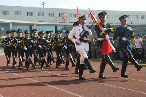 升国旗,奏国歌。飒爽英姿的国旗队队员迈着矫健的步伐走过主席台,充分展示出朝气蓬勃年轻人强烈的国防意识的爱国主义精神风貌。全场行注目礼,共同感受这一庄严仪式的神圣与感动。