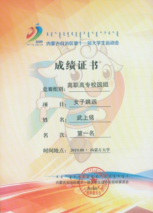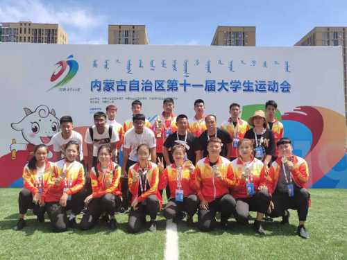 8月13日,由内蒙古自治区教育厅主办,内蒙古大学承办的第十一届内蒙古自治区大学生运动会(田径项目)在内蒙古大学顺利闭幕。本次比赛共设有田径、足球、篮球、排球、武术、乒乓球等10个大项216个小项;来自自治区各高校共51个代表队近1万名师生参赛。我院斩获3块金牌,2块银牌,3块铜牌;校园组获得团体总分第五名的成绩,我院教师宫资程、刘志辉、齐会杰、秦天宇荣获内蒙古第十一届大运会田径优秀教练员荣誉称号,学院荣获体育道德风尚奖。