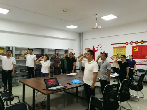 面对鲜红的党旗,联合党组织委员、思政部党总支宣传委员王海军带领全体党员重温入党誓词。入党誓词短短十二句话,句句千钧,既包括了党对党员的基本要求,也概括了党员对党组织和党的事业所应承担的政治责任和历史使命。