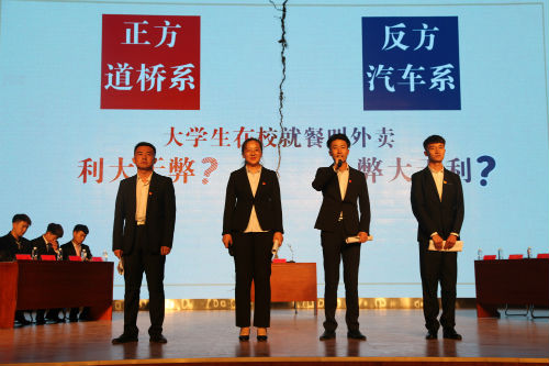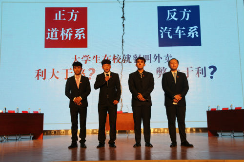 双方围绕着“大学生就餐叫外卖的利与弊”展开辩论,经过激烈角逐,道路桥梁工程系代表队荣获首届校园事务辩论大赛现场辩论赛冠军;汽车工程系代表队荣获亚军;建筑工程系代表队荣获季军;道路桥梁工程系代表队的赵咏琪荣获“最佳辩手”;汽车工程系代表队吴越超和道路桥梁工程系代表队于洋荣获“优秀辩手”。
