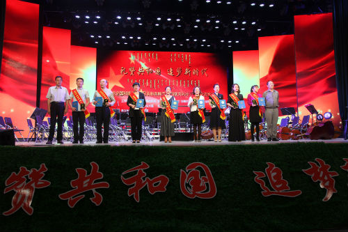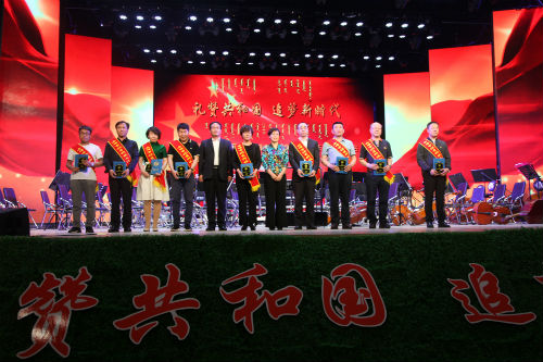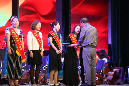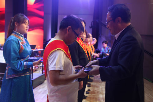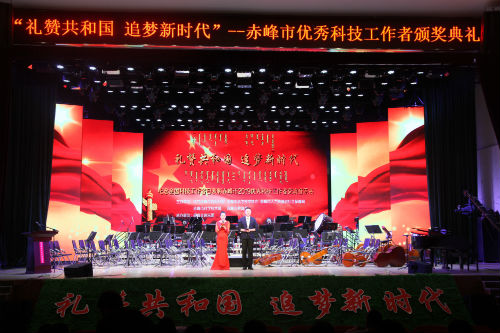 5月30日,在“礼赞共和国追梦新时代”——赤峰市优秀科技工作者颁奖典礼上,市领导为“优秀科技工作者”颁奖。