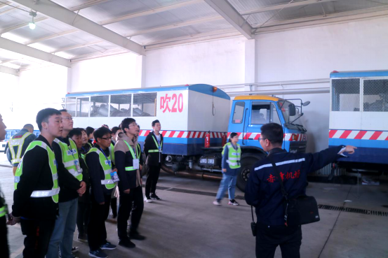 在参观特种车库和消防车库时,各位党员近距离地观摩了消防车、吹雪车、除冰车、电气源车、排污车、应急救援车等特种车,工作人员介绍了特种车的用途和性能。