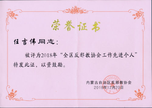 根据内蒙古自治区反邪教协会颁发的内反协发〔2018〕13号《关于表彰2018年全区反邪教协会工作先进个人的通报》文件,表彰全区范围内李海峰等52名基层反邪教协会工作先进个人,我院教师任吉伟被授予“2018年全区反邪教协会工作先进个人”荣誉称号。