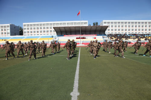 庄严升国旗仪式后,进行了方队分列式和民兵应急连汇报表演。