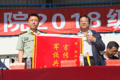 在热烈的气氛中,尚庆华院长向松山区人民武装部赠送锦旗。随后,向优秀教官、军训标兵、优秀宿舍、优秀方队依次颁奖。