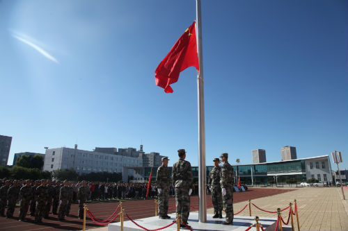 升国旗,奏国歌。飒爽英姿的国旗队队员迈着矫健的步伐走过主席台,充分展示出朝气蓬勃年轻人强烈的国防意识的爱国主义精神风貌。全场行注目礼,共同感受这一庄严仪式的神圣和感动。