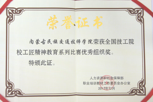 在全国技工院校工匠精神教育系列大赛中,内蒙古民族交通技师学院荣获工匠精神教育系列比赛优秀组织奖,思政教学部教师孙延冰题为《浅析工匠精神教育与技工院校德育课的融通》荣获工匠精神教育论文三等奖,机械工程系学生刘天明作品《工匠是如何练成之苦练基本功》荣获“寻找最美小工匠”摄影比赛手机组优秀奖。