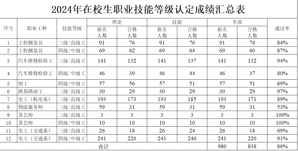 根据技能人才培养与评价工作计划,我院开展本年度毕业学年在校学生职业技能等级认定工作,现将成绩公示如下:
