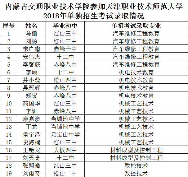 自2015年与天津职业技术师范大学签订合作办学协议,正式成为天津职业技术师范大学在内蒙古自治区的单独招生生源基地。学院高薪聘请专业师资担任特招班日常教学工作,经过全体师生不懈努力,参加2018年单独招生考试的同学们取得了优异的成绩,详情如下: